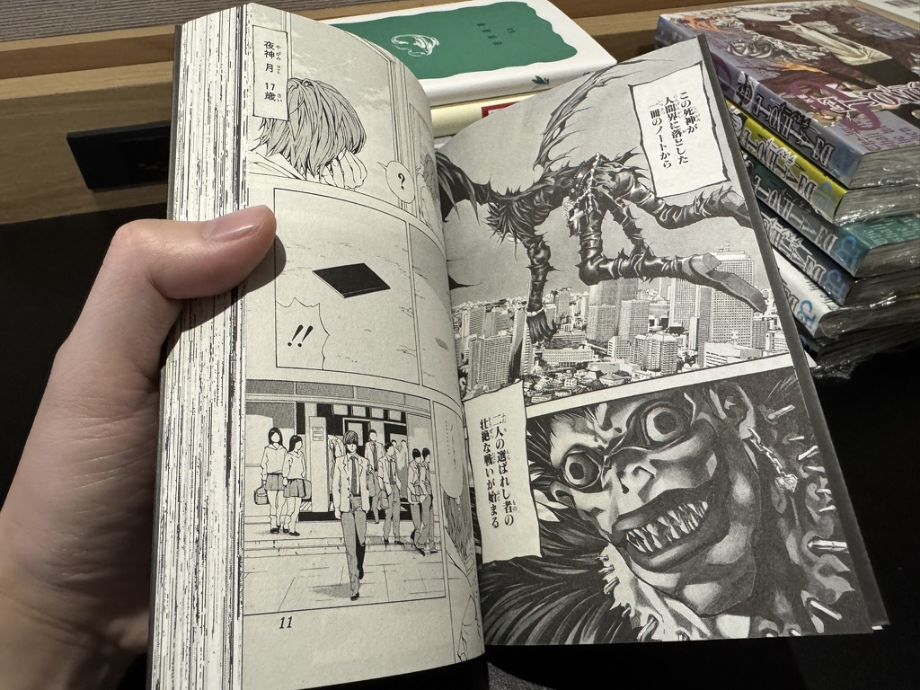 回到酒店迫不及待地拆开来看,小畑健的画风果然牛逼。以前其实我并不看漫画,这次可以说是第一次看,没想到一翻开就将我深深吸引,原来漫画这么美好,每一页都是艺术的享受。虽然动画有音效以及对白,但是漫画里的分镜,对白,字体,线条,一切都是那么美好。