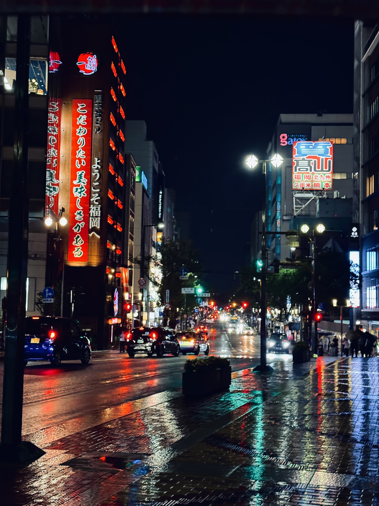 酒店定在博多站附近,从机场到博多很近,地铁只需两个站。现在已经可以在苹果手机里设定西瓜卡以及为其充值,坐地铁的时候已经可以直接扫手机进出,非常方便。出站之后便是晚上宁静的福冈,和东京大阪不同,福冈的晚上非常宁静,路上行人不多,更没有嘈杂的环境声音,我们一行人拖着行李在凹凸不平的水泥地上行走的声音,都会让人产生打破这种宁静的尴尬。