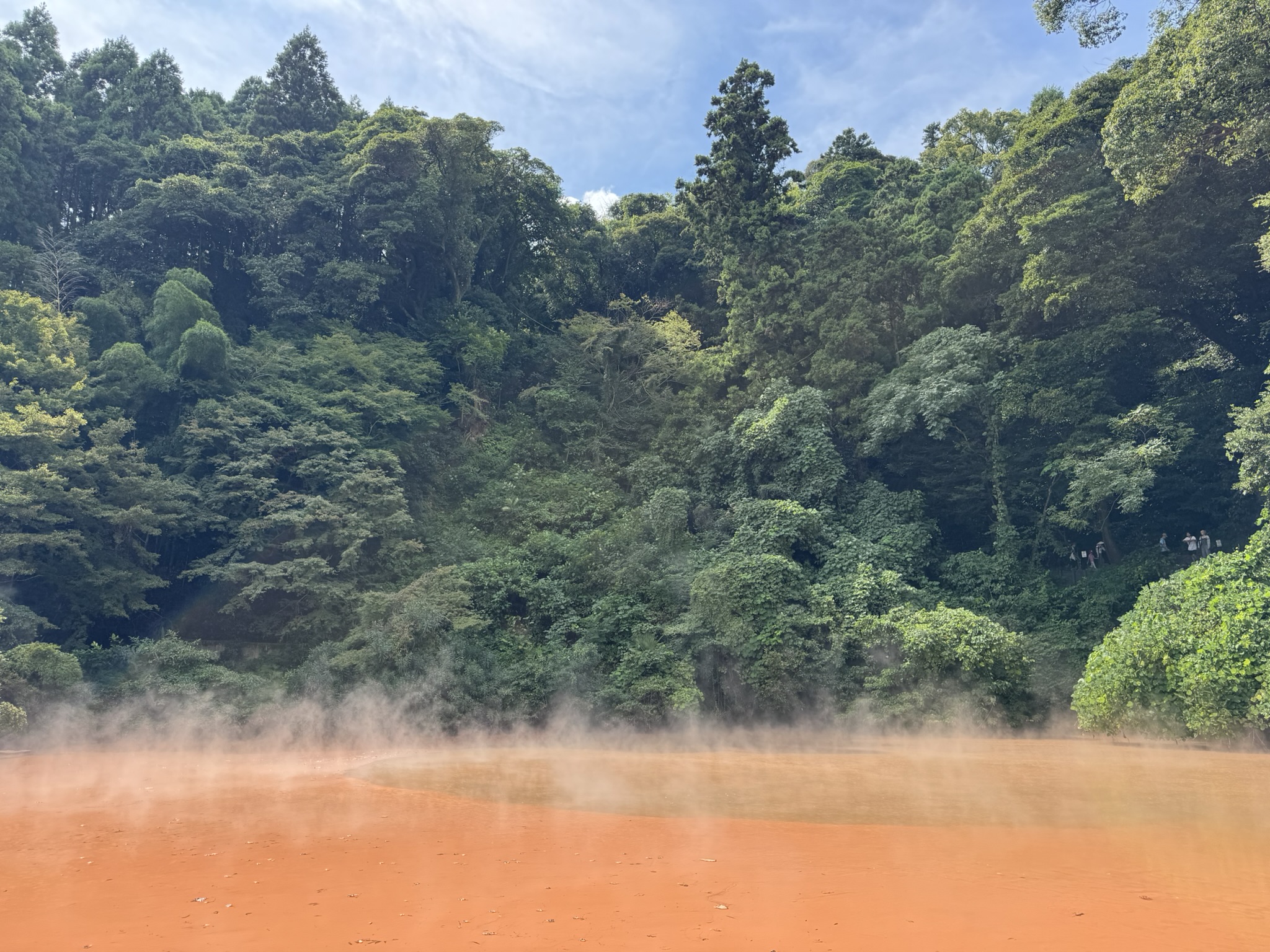 今天继续好天气。这么蓝的天空,在国内都不知道有多久没看到过了。今天走的完全是游客线路,地狱温泉打卡。别府地狱温泉有七个,只要买了通票就会发一个打卡纸,但说实话,这几个点基本上都是很小很小的池子,只是不同颜色,不同规模。比如下面的血池地狱,就是混了泥土的颜色所以看起来有点红,但实际上就是一个很小的池子。