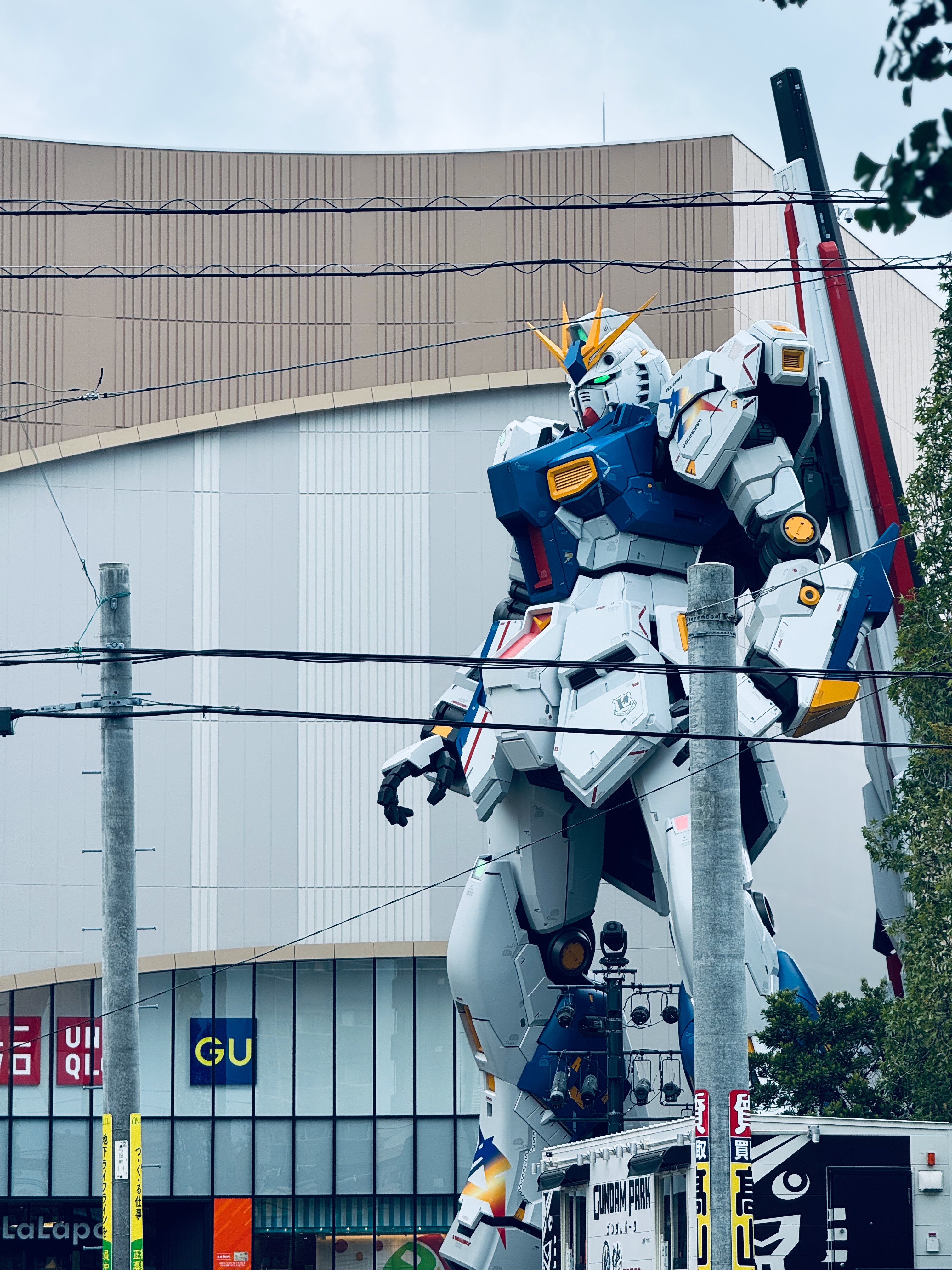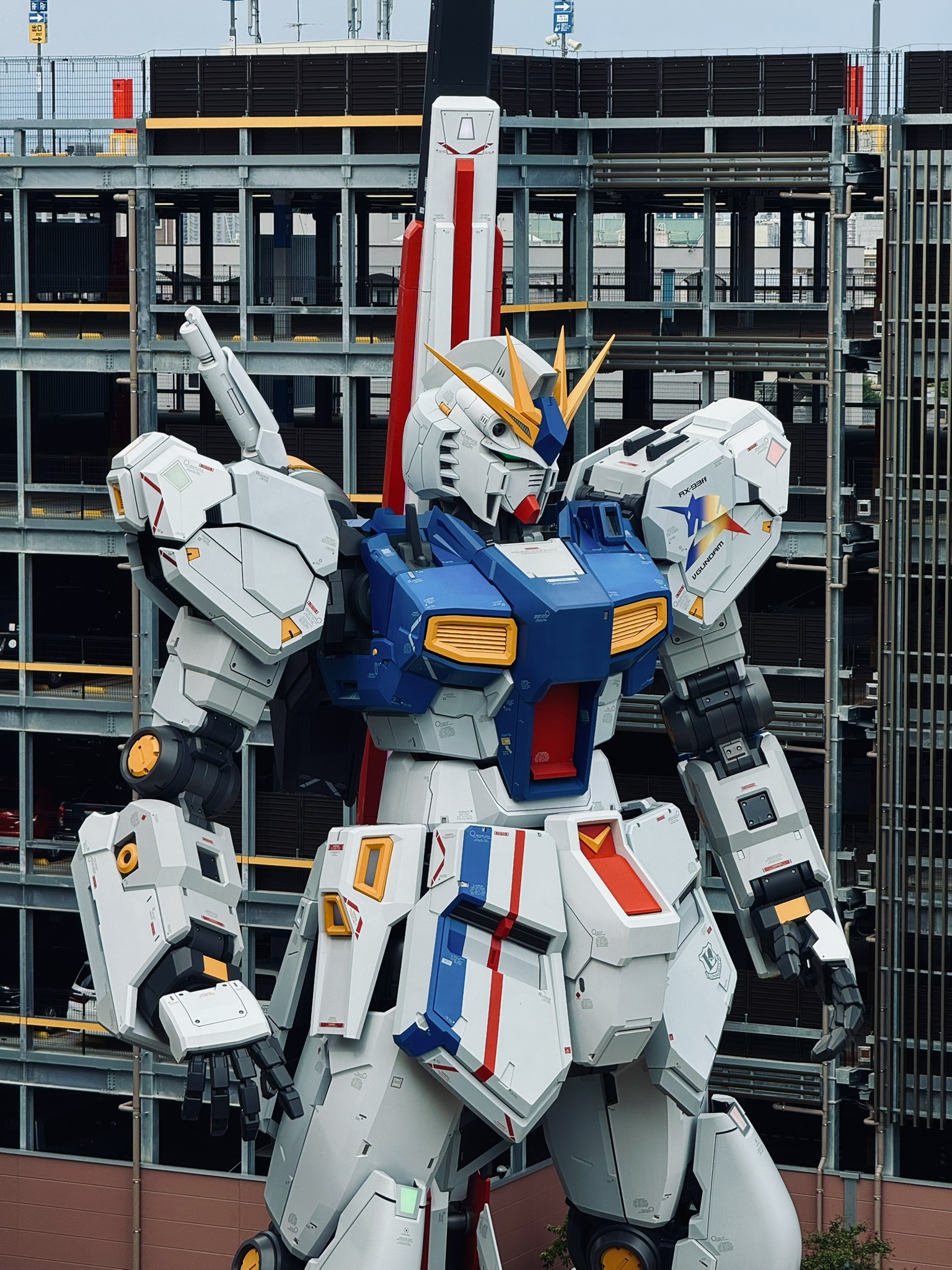 不知不觉到了最后一天,忽然就有点不舍了。早上发疯似地想去更多的地方,然而已经没有太多时间。于是决定还是到高达那里打个卡。坐公交到 lala port,公交还是停在一个街区里的,所以也并不是一下车就能看到巨型高达。从另一边的入口进入 lala port,穿过整个商场之后,才在正门看到高达。不得不说还是有点震撼的,这种机械巨物也算是第一次看到,今天天气不是很好,但是在日本空气质量非常好,白色的福冈牛看着非常雪白,加上红蓝配色以及黑色衬线,无比的秩序感。