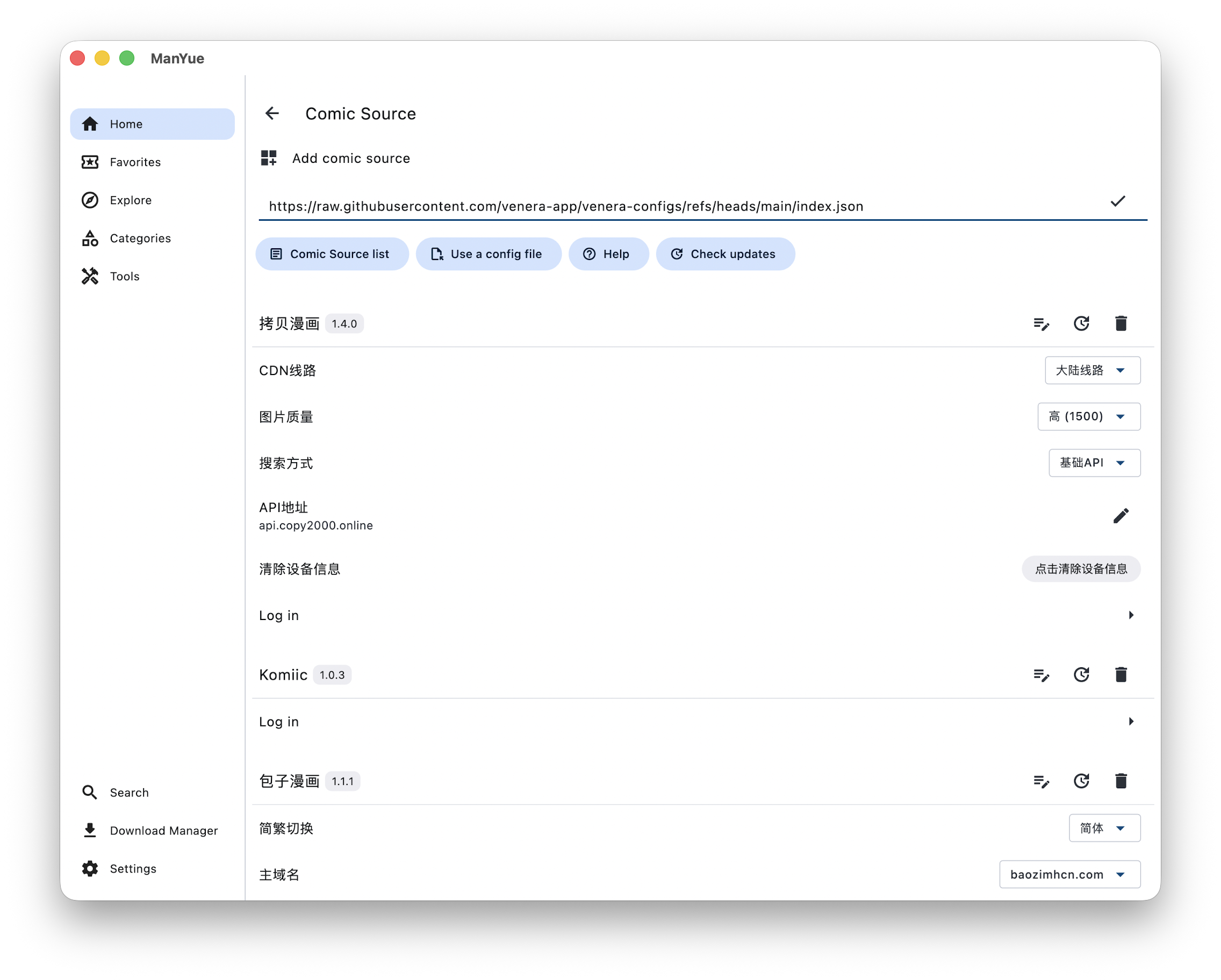 线上漫画 发表于 2025-11-26 分类于 Computer Disqus: 本文字数: 123 阅读时长 ≈ 1 分钟 最近迷上了漫画,纸质版当然是最优首选,不过在线看应该作为一个备选项。购买纸质之前也可以先看看在线版的画风是否符合自己的审美。 “漫阅”是一个支持多端的在线漫画 APP,非常好用,而且没有广告。 进入 APP 之后添加漫画源。 https://raw.githubusercontent.com/venera-app/venera-configs/refs/heads/main/index.json 添加漫画源之后,就能在“浏览”里搜索各种漫画了。